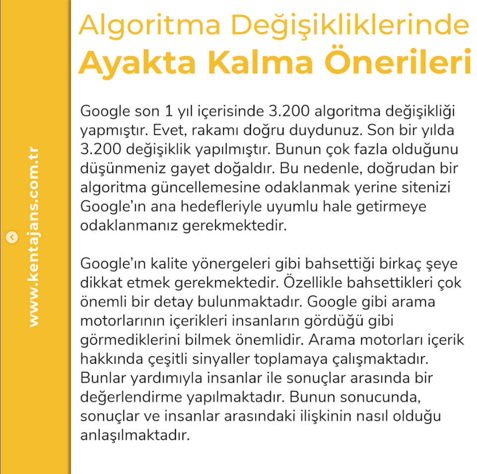 Google son 1 yıl içerisinde 3.200 algoritma değişikliği yapmıştır. Evet, rakamı doğru duydunuz. Son bir yılda 3.200 değişiklik yapılmıştır. Bunun çok fazla olduğunu düşünmeniz gayet doğaldır. Bu nedenle, doğrudan bir algoritma güncellemesine odaklanmak yerine sitenizi Google’ın ana hedefleriyle uyumlu hale getirmeye odaklanmanız gerekmektedir.