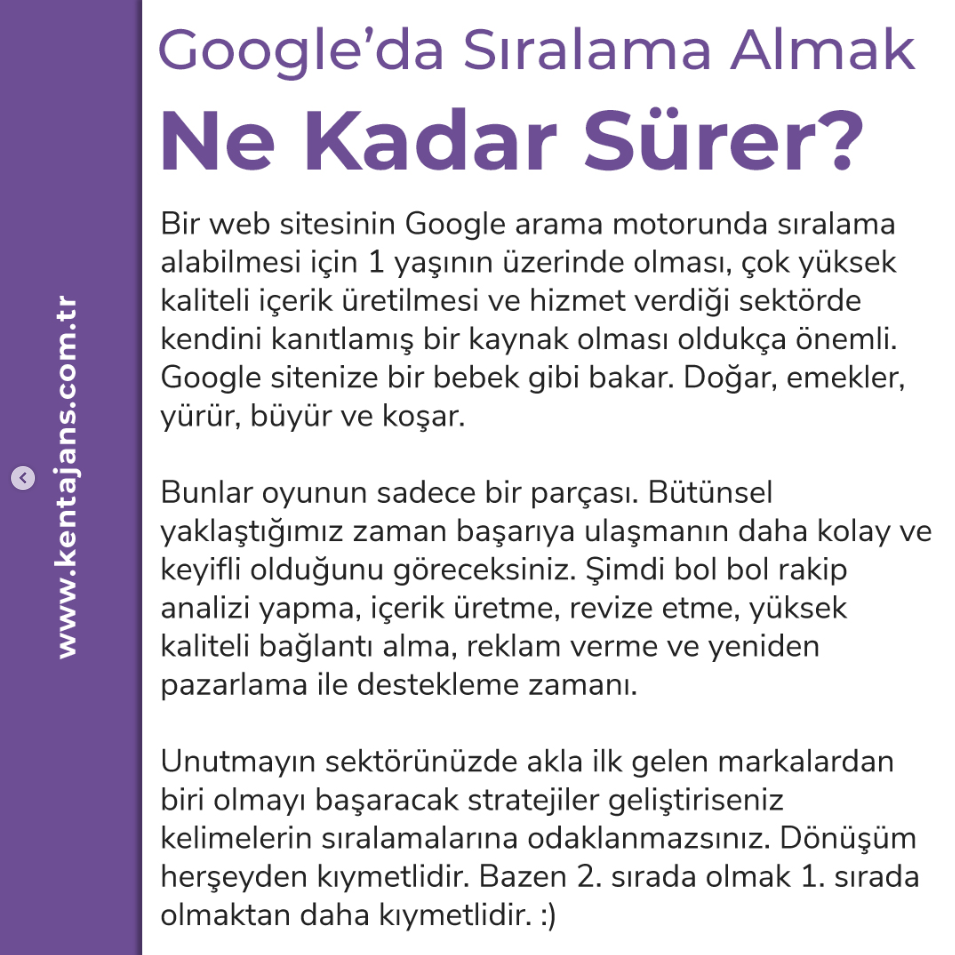 Bir web sitesinin Google arama motorunda sıralama alabilmesi için 1 yaşının üzerinde olması, çok yüksek kaliteli içerik üretilmesi ve hizmet verdiği sektörde kendini kanıtlamış bir kaynak olması oldukça önemli. Google sitenize bir bebek gibi bakar. Doğar, emekler, yürür, büyür ve koşar.