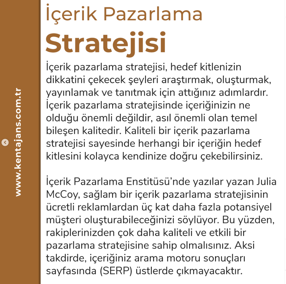 İçerik pazarlama stratejisi, hedef kitlenizin dikkatini çekecek şeyleri araştırmak, oluşturmak, yayınlamak ve tanıtmak için attığınız adımlardır. İçerik pazarlama stratejisinde içeriğinizin ne olduğu önemli değildir, asıl önemli olan temel bileşen kalitedir. Kaliteli bir içerik pazarlama stratejisi sayesinde herhangi bir içeriğin hedef kitlesini kolayca kendinize doğru çekebilirsiniz.